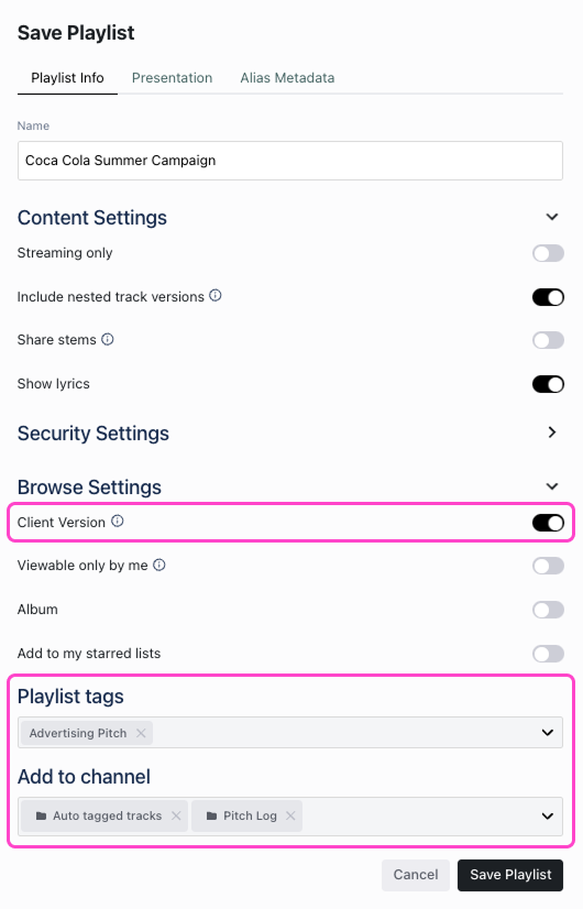 The important thing is that sent playlists live somewhere intentional and are tagged or marked as Client Version (in the Save Playlist settings) - rather than simply mixing with all the other playlists in Browse. A Pitch Log Channel also makes it easier to filter reports later.