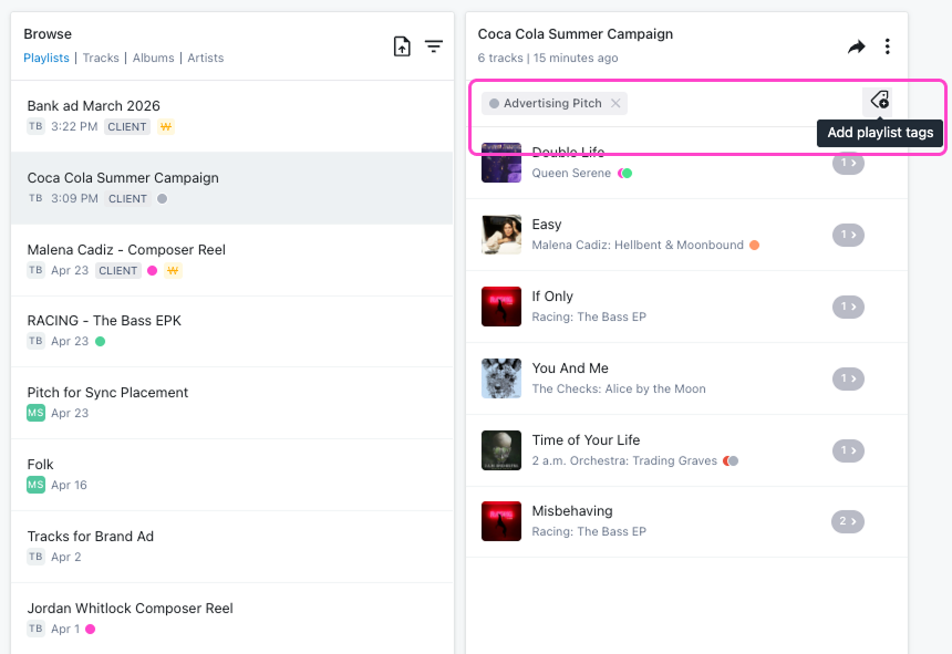 If your team is pitching to a specific client, tag all relevant playlists with that client's name. If the work relates to advertising, also apply an Advertising tag. Later, those tags make it much easier to see every playlist connected to that client or media type - even if the playlists live in different folders or were created at different times.