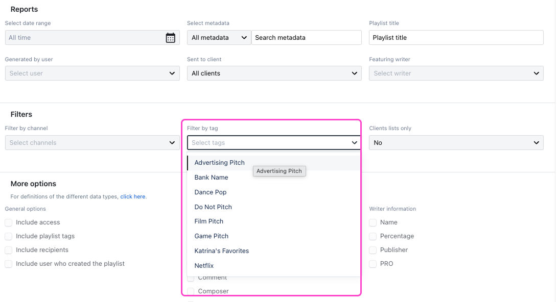 Many teams pitch across several kinds of opportunities. If you consistently tag playlists as Film, TV, Advertising, Radio, or another relevant media type, your reports become much more meaningful. Rather than just seeing a long list of playlists, you can filter outbound work by the kind of opportunity it supported - making it easier to answer questions like how many film pitches went out this quarter, or how much TV-related pitching a specific artist received.
