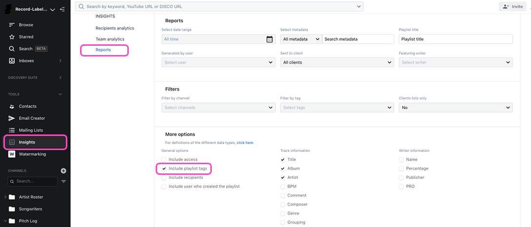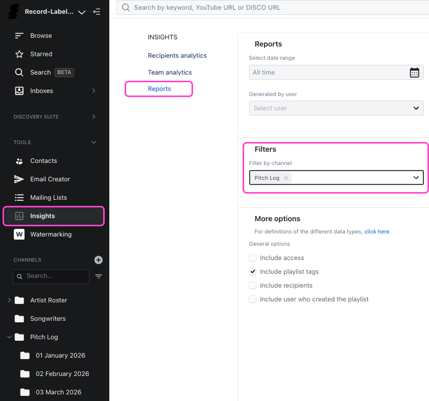 The best reporting systems usually start before you ever open the Reports area. When you save or file a pitched playlist, try to do it consistently - adding it to the Pitch Log Channel, placing it in the correct month folder, applying the right playlist tags, and marking it as a Client Version if it was actually sent externally.